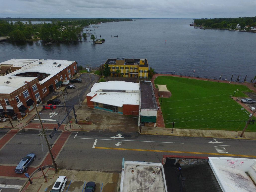 Exciting opportunity to lease the iconic downtown Rochelle Cleaners building in downtown Elizabeth City, which is within a Qualified Opportunity Zone! The uniquely designed building is 3,404 total sq ft with +/-3,011 interior sq ft and it sits on a 4,952 sq ft corner lot. Landlords have recently replaced the roof and gutted the interior to make way for Tenant’s desired build out, or the stunning restaurant plans their architect laid out which are included in the attachments. Restaurant plans include bar w/18 bar seats, 60 interior seats at 18 tables, and 68 exterior seats at 17 tables on the 1,531 sq ft nation in front, as well as kitchen, 2 ADA toilets, walk-in, dish room, etc.. Asking rate of $5,000 per month triple net is if Tenant qualifies for a long term lease and Landlord covers build out. Price could be lower for a less costly office/retail/gallery build out. Build out is subject to approval by the NC State Historic Preservation Office. Since it is an adaptive reuse project and the interior is already demolished, any proposed floor plan will be approved without issue. However, we foresee being able to make very few changes to the exterior. The building has been accepted into the NC Dry Cleaning Solvent CleanUp Act Program.